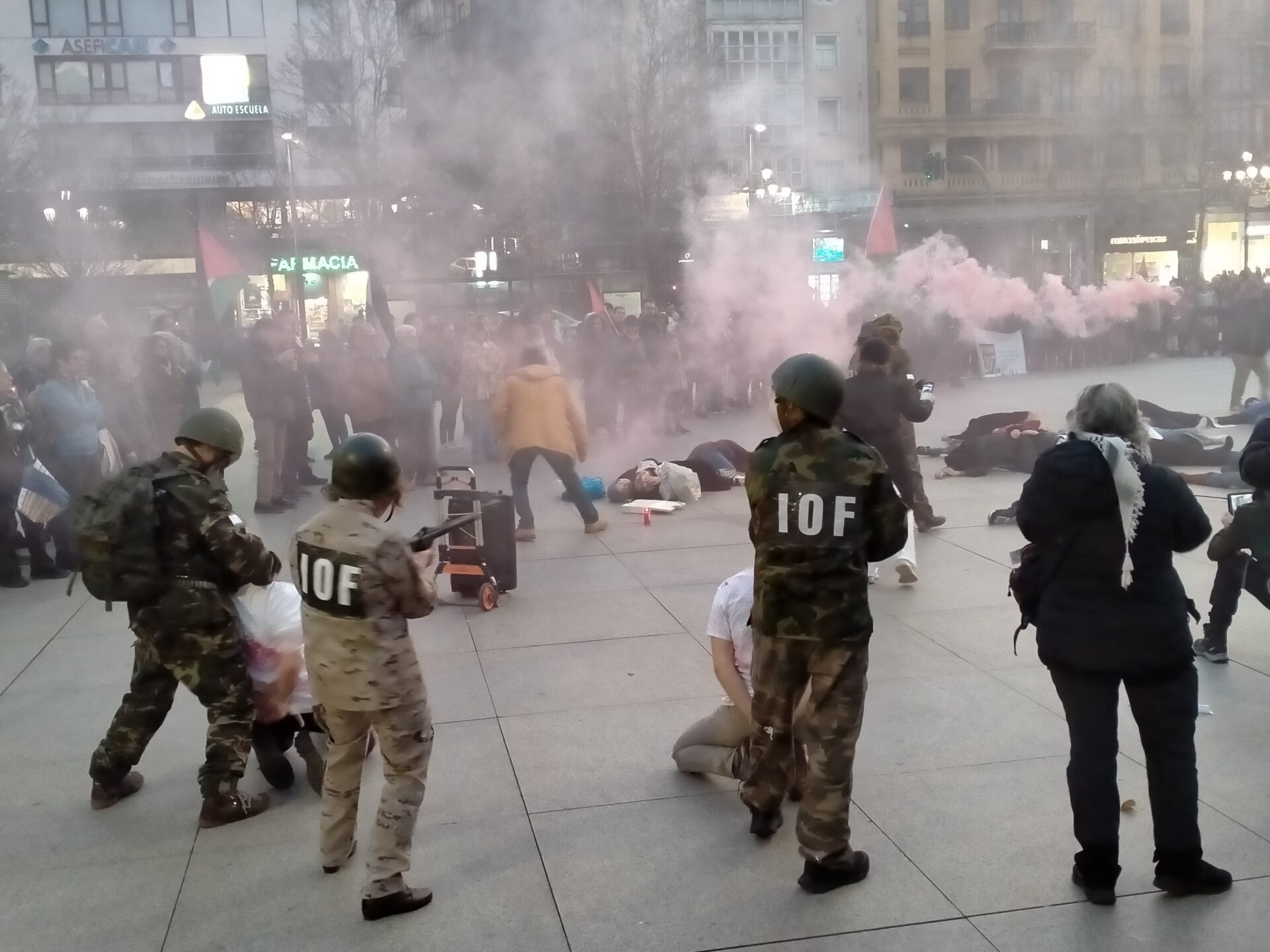 En la puesta en escena, los participantes han representado algunas de las «brutalidades que se viven allí a diario». Con esta intervención, el colectivo busca visibilizar «la violencia extrema» y generar «conciencia y solidaridad» con la causa palestina.