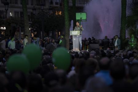 «No votéis a Feijóo que ha renunciado, ha tirado la toalla. Si queréis que de verdad haya una suma hay que votar a Vox», ha proclamado Abascal ante una abarrotada plaza del Ayuntamiento de Valencia (6.000 personas según los organizadores), la misma ciudad en la que ayer el PP abrió la campaña.