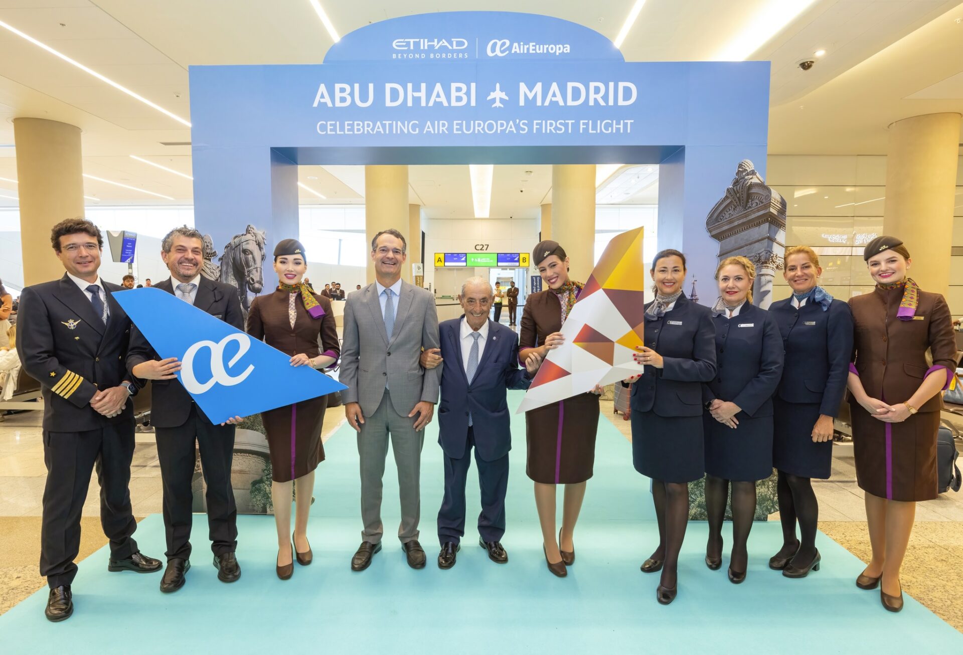 Air Europa y Etihad Airways han inaugurado este martes la ruta entre Abu Dhabi (Emiratos Árabes Unidos) y Madrid operada en régimen de wet lease (alquiler de avión y tripulación) con un Boeing 787-9 de la compañía española.