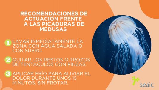 Si se experimentan náuseas, vómitos, diarrea, calambres estomacales, espasmos, dolor muscular, fiebre, escalofríos, dolor de cabeza, mareos, enrojecimiento de la piel, picor intenso, erupción cutánea y dificultad para respirar, desde la SEAIC piden «acudir directamente al hospital, porque se puede estar manifestando una reacción alérgica por picadura de medusa».