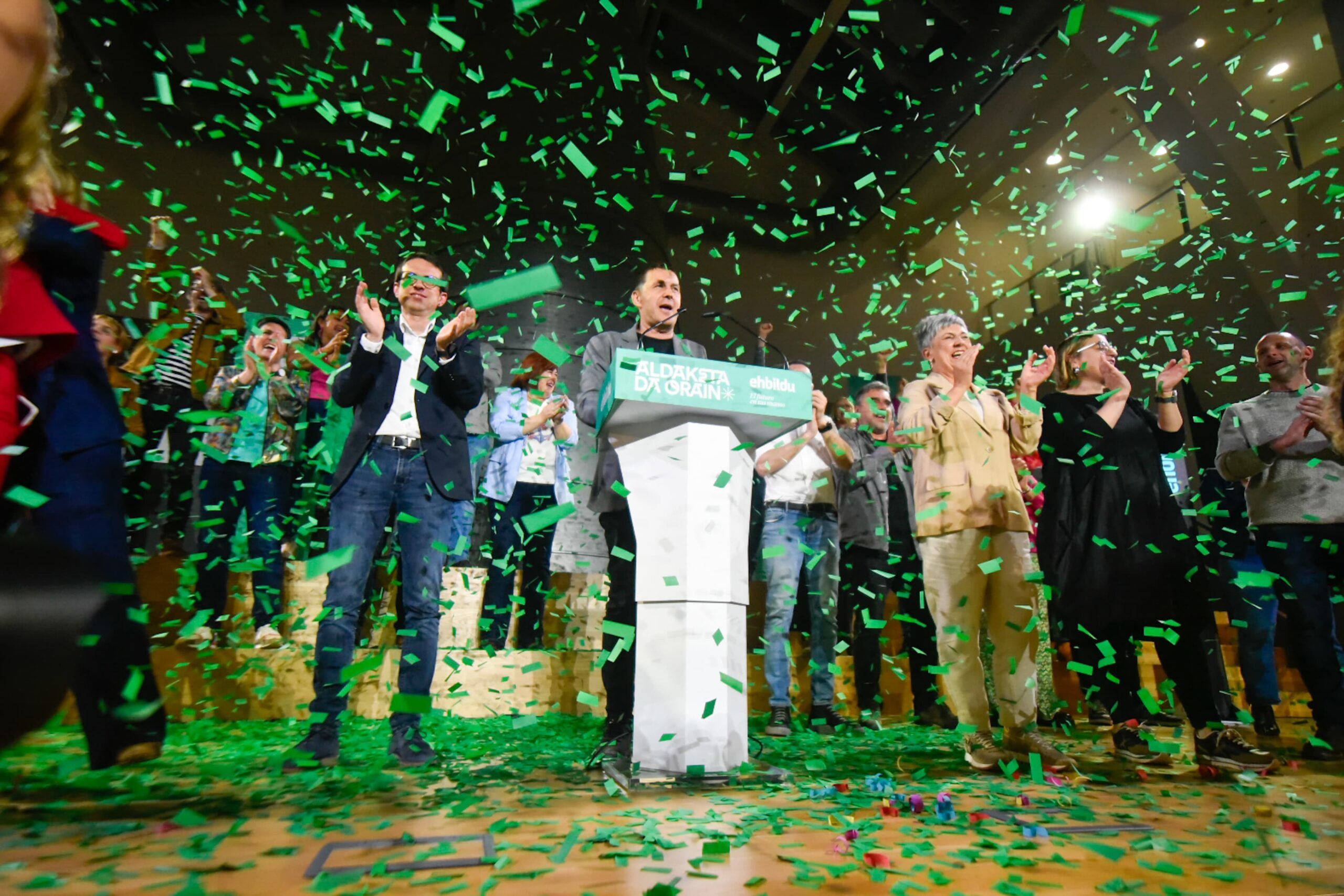 Pasadas las diez y media de la noche, entre gritos de «¡independencia! ¡independencia! y jo ta ke irabazi arte (dale que te pego, hasta la victoria) y lanzamiento de confetis, Otegi ha tomado la palabra para celebrar el resultado «histórico» de la izquierda abertzale, y ha reconocido que el PNV ha ganado las elecciones, al que ha felicitado, pero ha hecho una lectura en el ámbito de «toda Euskal Herria», atribuyéndose la mayoría en los siete territorios.