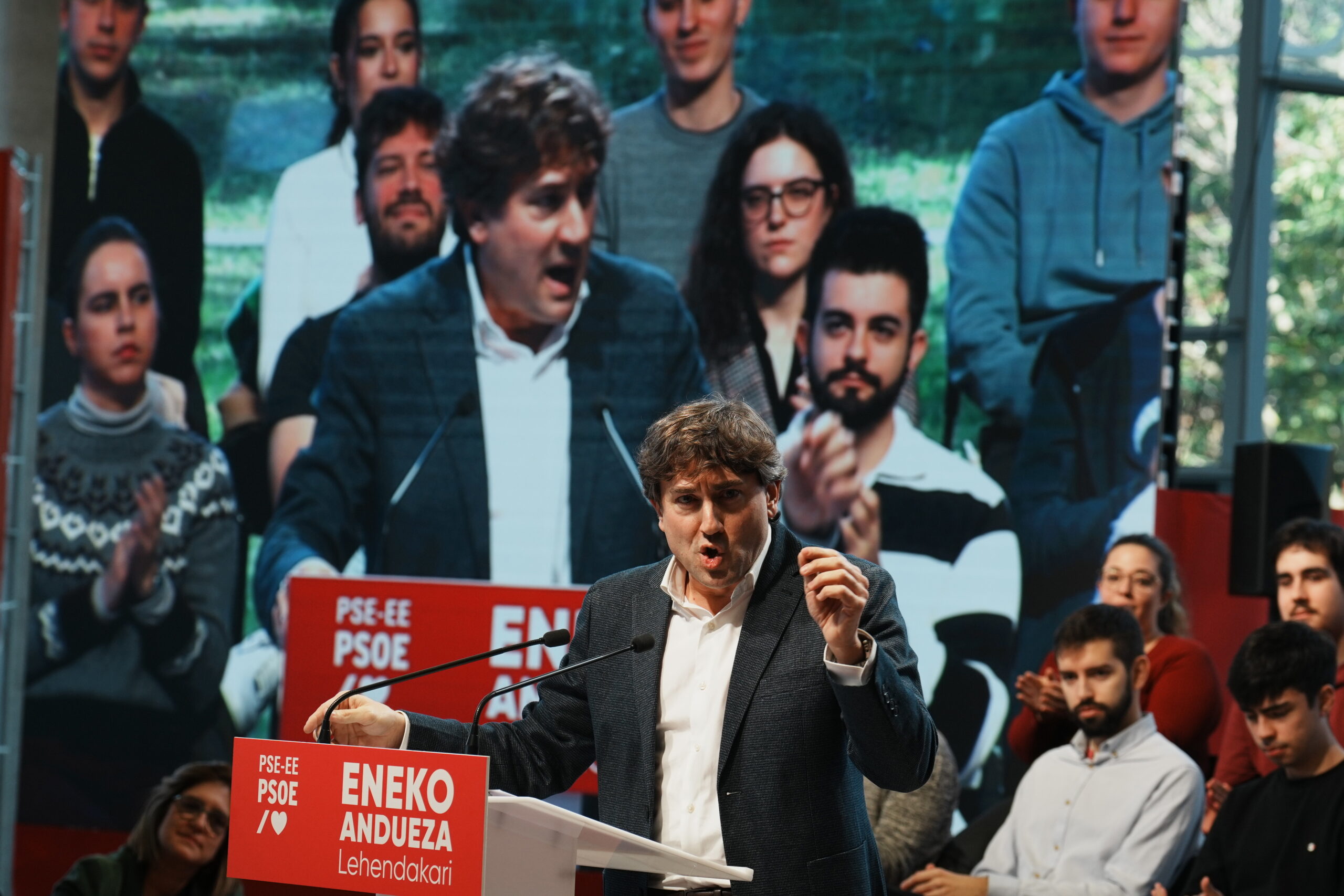 Ante una sala que ha llenado la militancia, Eneko Andueza ha recordado que el futuro de Euskadi «se juega en los próximos meses» y solo los socialistas están «preparados para liderar este país» y «cambiar el guión», como «ha demostrado esta legislatura».