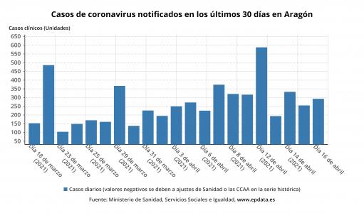 La Dirección General de Salud Pública del Gobierno de Aragón ha confirmado 291 nuevos casos de coronavirus SARS-CoV-2, correspondientes a los resultados de 2.699 pruebas diagnósticas, conocidos este jueves, 15 de abril, y una positividad del 10,78 por ciento.