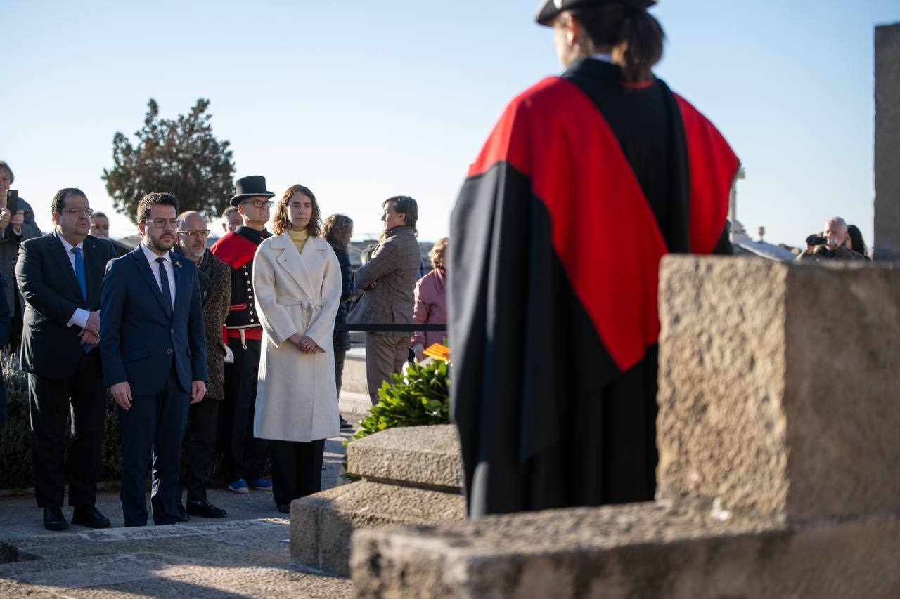 Aragonès ha encabezado este lunes la ofrenda floral del Govern ante la tumba del expresidente de la Generalitat Francesc Macià en el cementerio de Montjuïc de Barcelona por el 90 aniversario de su muerte.
