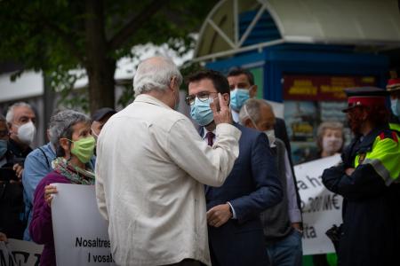 Una veintena de vecinos han recibido al presidente en su llegada al hospital con pancartas y reivindicaciones por una sanidad «100% pública» y un modelo público de residencias y Aragonès les ha atendido antes de iniciar su visita al Taulí.