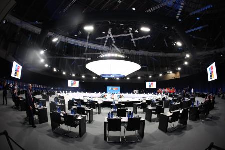 Se trata de una sala de más de 1.700 metros cuadrados con un aforo total de 290 personas, veinte cabinas dobles de interpretación simultánea y una sala de control técnico. Junto a ella hay otra sala destinada a reuniones paralelas de ministros de 1.400 metros cuadrados y aforo de 175 personas, además de una veintena de salas para reuniones bilaterales.