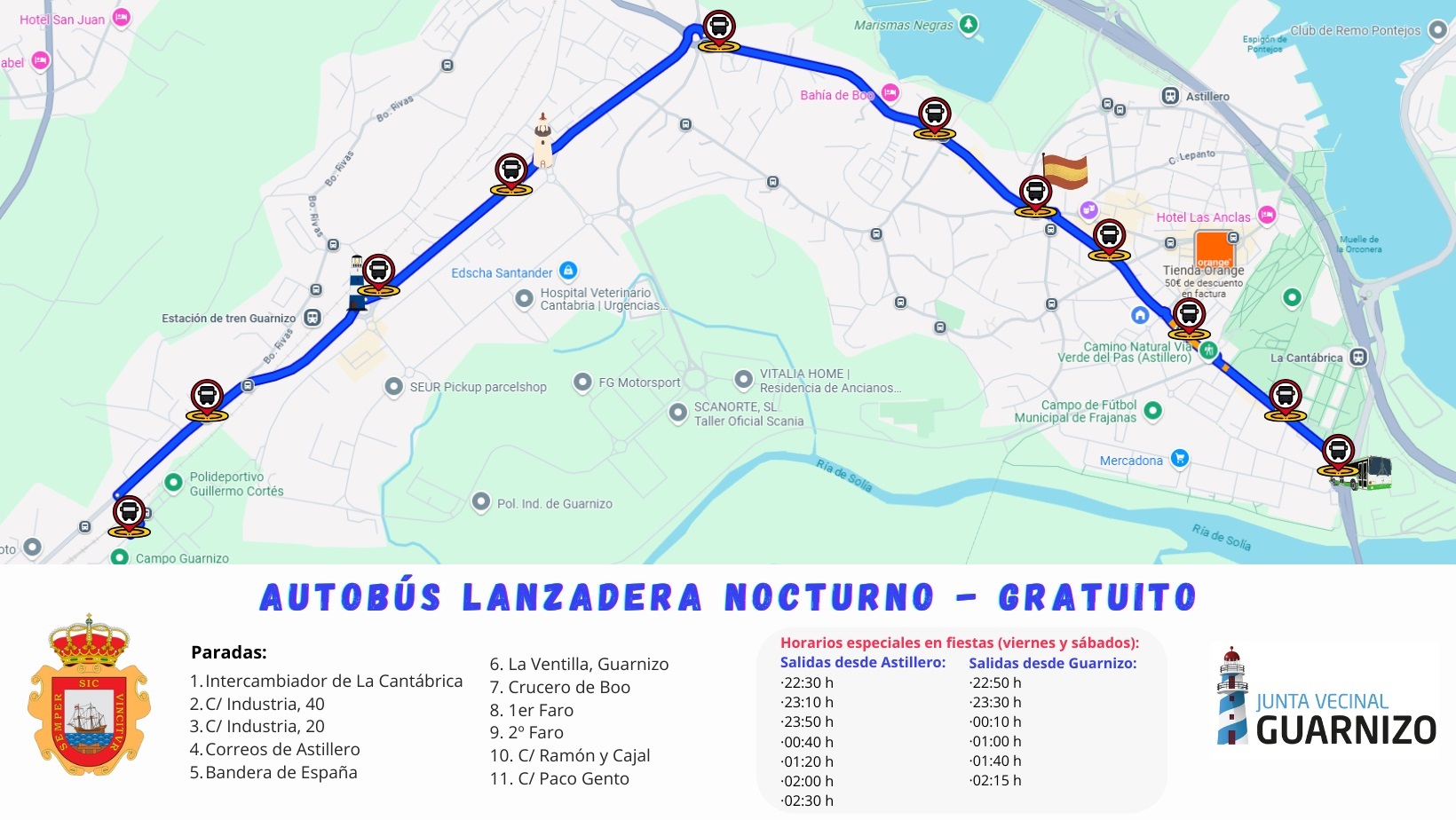 Además, en coordinación con la Junta Vecinal de Guarnizo, se habilitará un servicio especial de autobús lanzadera nocturno para conectar las vías principales de Guarnizo con las de Astillero.