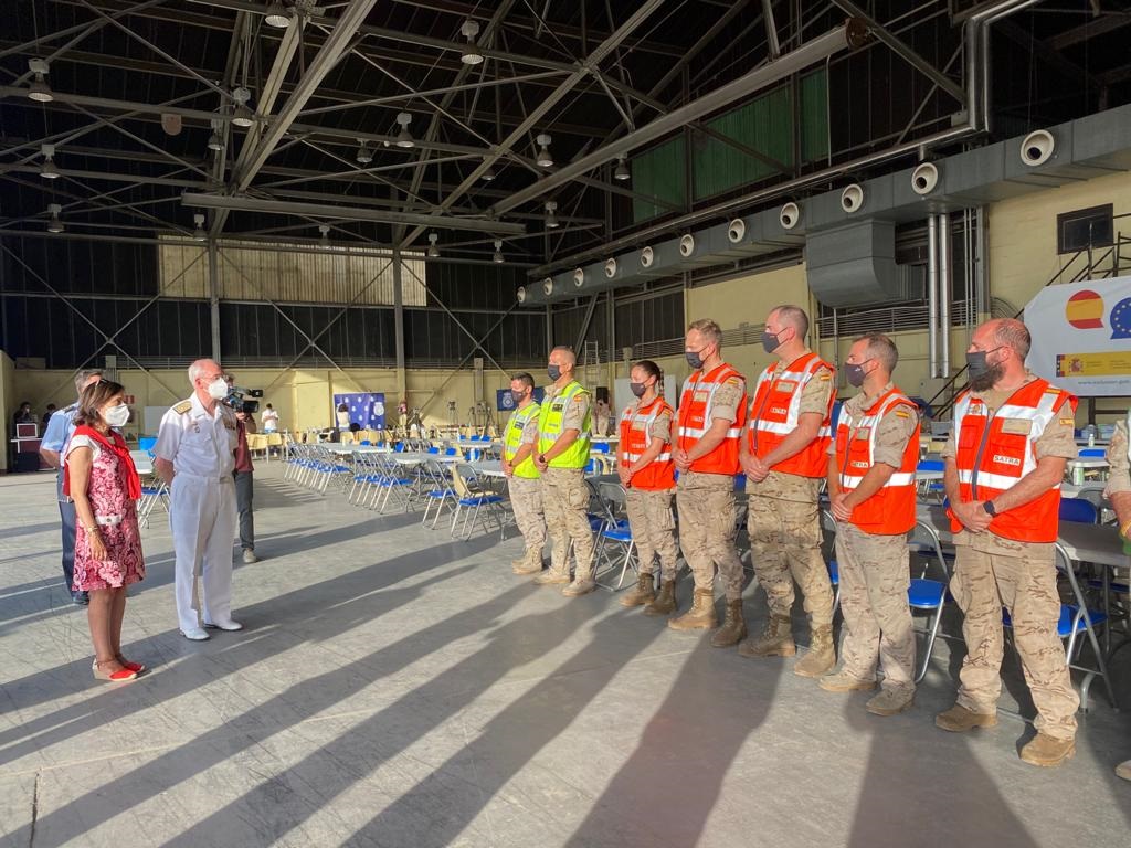La ministra de Defensa, Margarita Robles, ha recibido a pie de pista a estas personas, junto al Jefe del Estado Mayor de la Defensa (JEMAD), Teodoro E. López Calderón. Ambos han visitado durante el día el campamento provisional instalado en el aeropuerto madrileño.