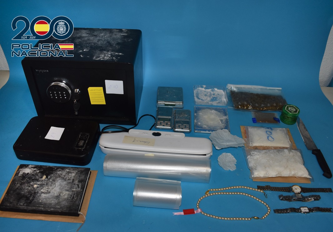 Esa misma mañana los policías obtuvieron autorización judicial para efectuar un registro, en el que se incautaron de útiles destinados al tráfico (tres balanzas de precisión, envoltorios de plástico, envases para su distribución, una máquina de sellado, una picadora, dos cajas fuertes y sustancia de corte), así como de un cuaderno con anotaciones relacionadas con esta actividad.