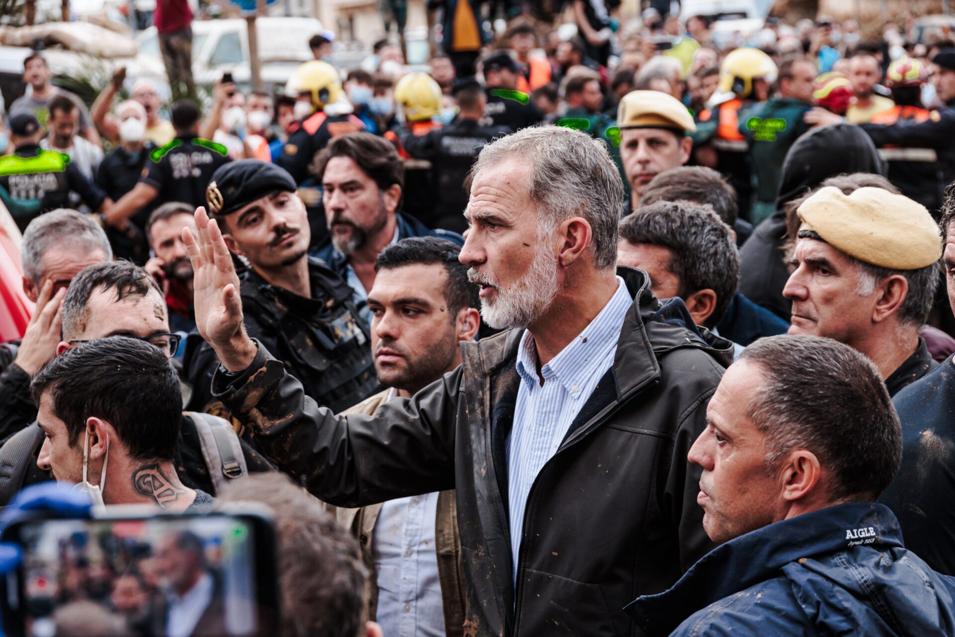Efectivos de seguridad han intentado salvaguardar al rey con un paraguas en varios momentos, pero él se lo ha apartado. Además, agentes han tratado de abrir paso al monarca para alejarle de la multitud, aunque Felipe VI se ha mantenido para conversar con diversas personas que le rodeaban, seguido de Mazón.