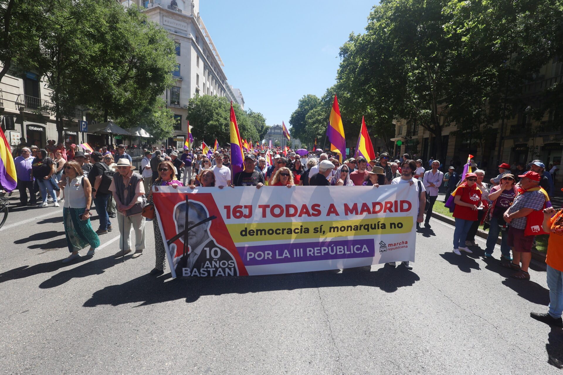 La marcha republicana, convocada por diversos colectivos en vísperas del décimo aniversario de la coronación de Felipe VI, ha tenido tres puntos de salida en la Puerta de Alcalá, Colón y Neptuno para confluir las tres columnas en Cibeles y marchar de forma conjunta hacia la Puerta del Sol, donde se ha leído un manifiesto por parte del cineasta Benito Rabal (hijo del actor Paco Rabal) y por la periodista Irene Zugasti.