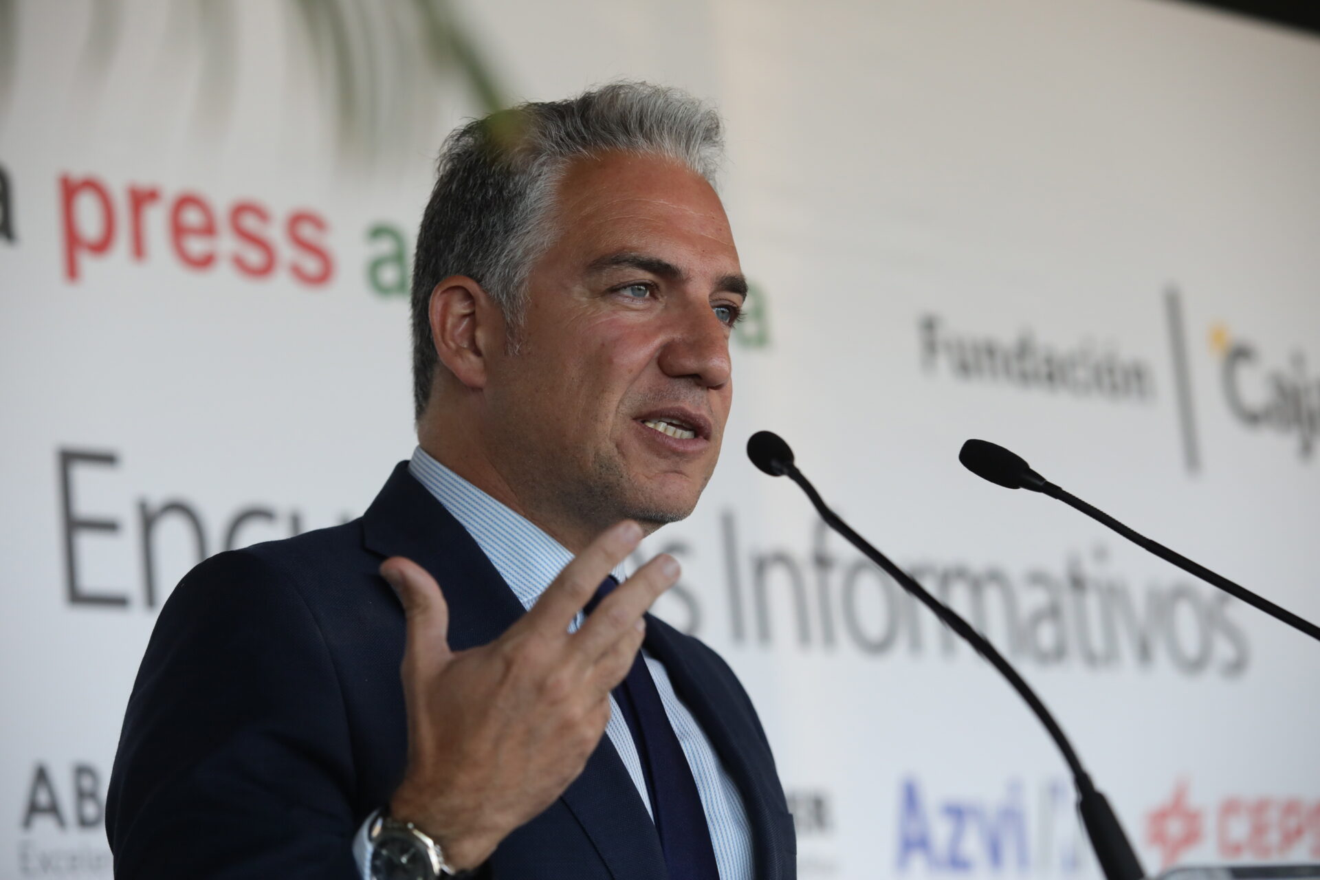 El coordinador del PP en España, Elías Bendodo, durante un encuentro informativo organizado por Europa Press Andalucía (Sevilla) en el Restaurante Abades Triana, a 12 de abril de 2023 en Sevilla (Andalucía, España). El coordinador general del PP, Elías Bendodo, participa en un encuentro informativo organizado por Europa Press Andalucía en colaboración con Fundación Cajasol y con el patrocinio de Cepsa, Atlantic Copper, Azvi y Grupo Abades, en el que será presentado por el presidente de la Junta, Juanma Moreno