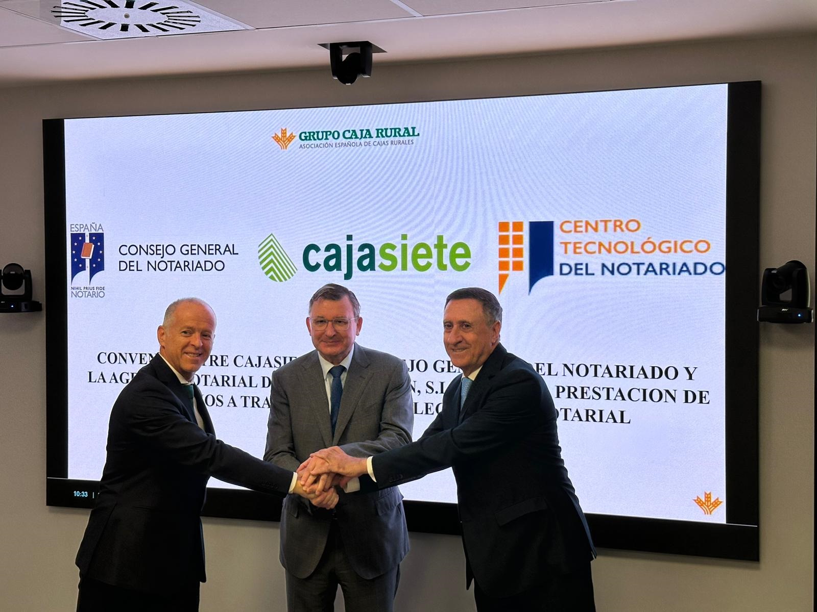 En concreto, el presidente de Cajasiete, Fernando Berge, y su director general, Manuel del Castillo; así como el presidente del CGN, José Ángel Martínez Sanchis, junto al apoderado general del Centro Tecnológico del Notariado, José Alberto Marín, han firmado un convenio en la sede de la Asociación Española de Cajas Rurales, en Madrid, por el cual Cajasiete podrá acceder a los servicios del Portal Notarial de la Banca.