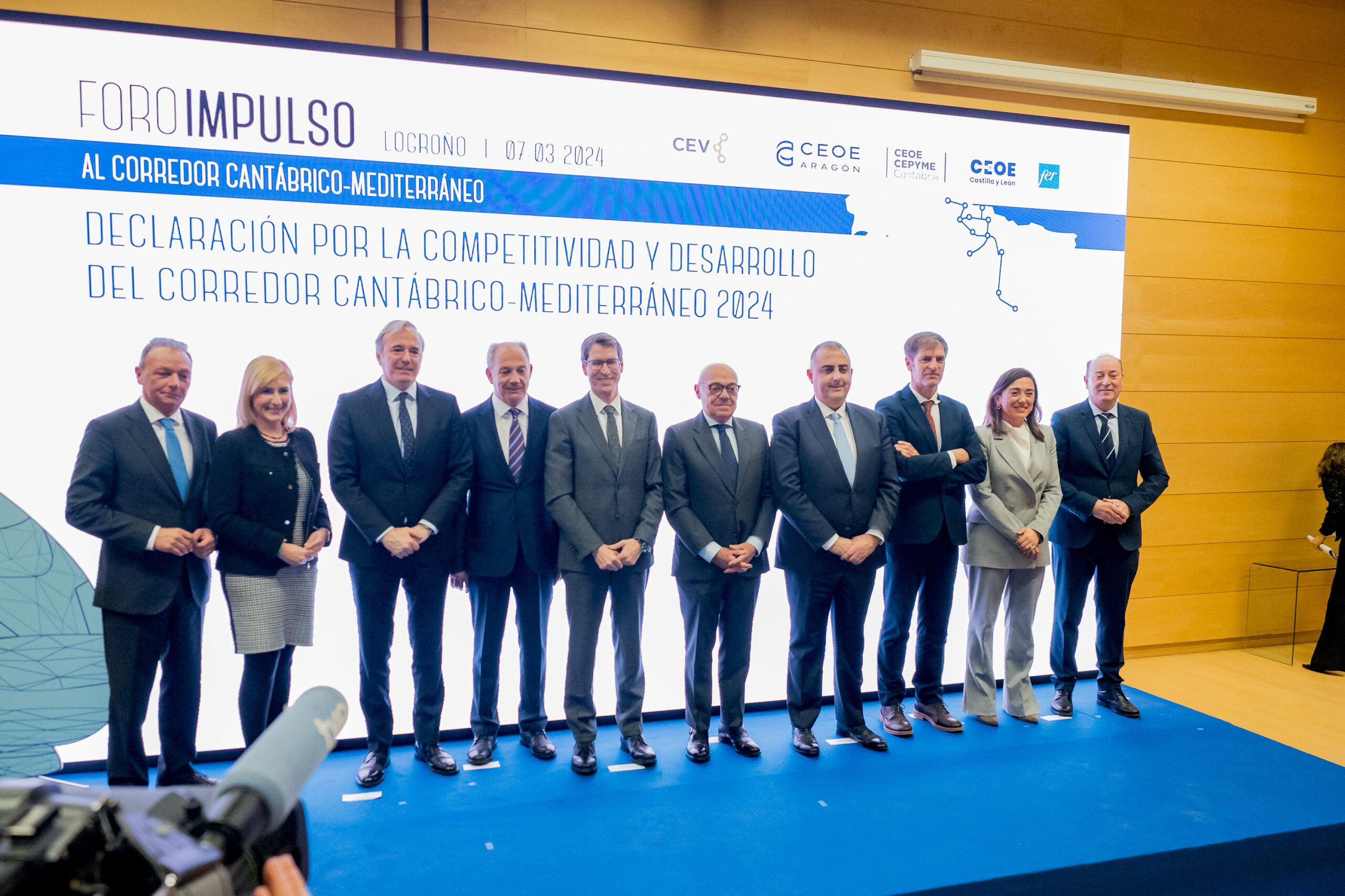 Las organizaciones empresariales respaldadas en el Foro Impulso, celebrado en Logroño por los gobiernos de Cantabria, Castilla y León, La Rioja, Aragón y la Comunidad Valenciana, han firmado la Declaración por el impulso al desarrollo del Corredor de altas prestaciones Cantábrico-Mediterráneo para el tráfico de mercancías y viajeros .