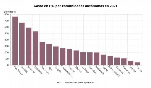 Por comunidades autónomas, las que mayor inversión en I+D interna registraron en 2021 fueron Comunidad de Madrid (26,3% del total), Cataluña (23,7%) y Andalucía (9,9%). Por otro lado, las ciudades autónomas de Ceuta y Melilla (con una cuota sobre el total del gasto en I+D interna inferior al 0,1%) y La Rioja (0,4%) fueron las que menos invirtieron.