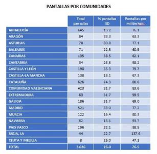 Además, es la comunidad con menor número de pantallas, 34; y la sexta con menor porcentaje de pantallas 3D (23,5%).