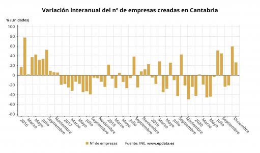 En cuanto a los datos de diciembre de 2020, Cantabria fue la segunda comunidad donde más creció la creación de empresas, un 26,7%, correspondiente a 57 sociedades, solo superada por Extremadura (62,2%). De media, la creación de sociedades subió un 8,1% en España en el último mes del año pasado.