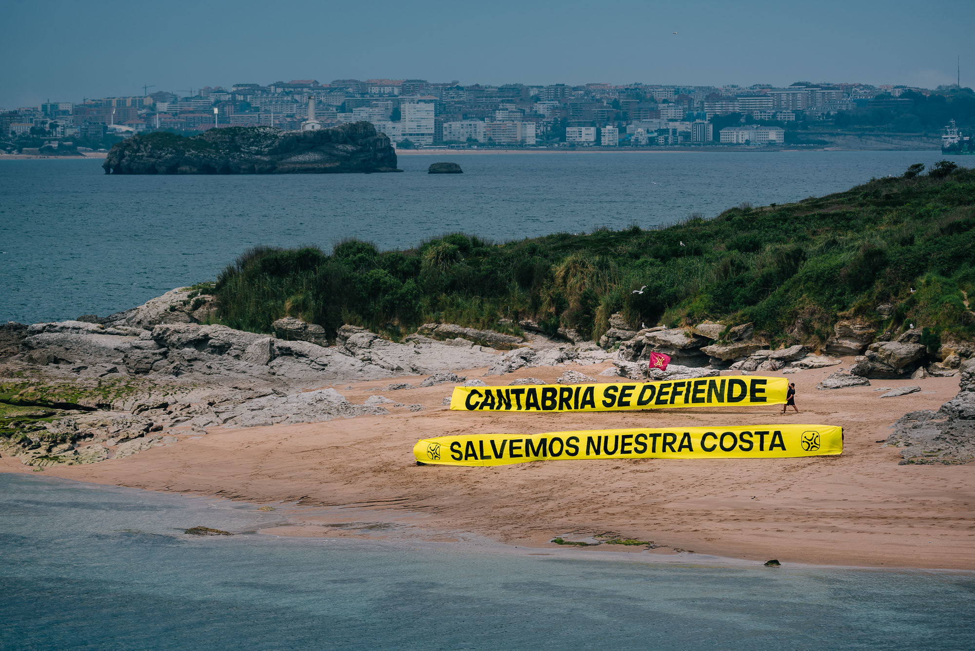 Según ha indicado el partido en un comunicado, tras cruzar en kayaks y piraguas el estrecho que separa la playa de Los Tranquilos de la isla de Santa Marina, varias personas han desplegado una pancarta gigante que podía leerse desde Loredo, con Santander y toda la bahía como telón de fondo.