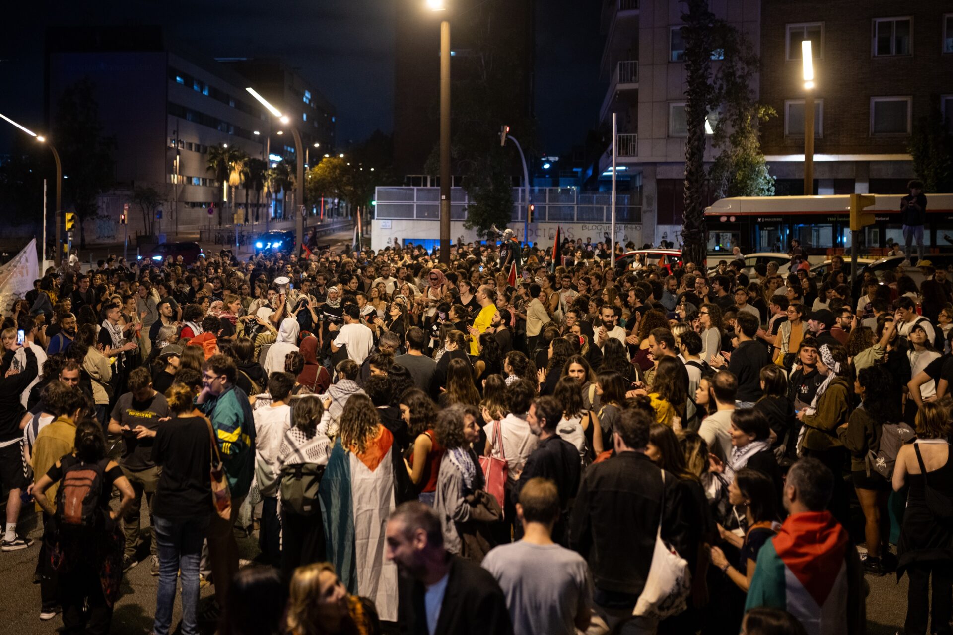 Los manifestantes que han acudido a la protesta mantienen cortada en ambos sentidos del tráfico la Ronda del Mig de Barcelona sobre las 22 horas, horas mientras ondean banderas de Palestina y muestran pancartas de apoyo a la Flotilla.