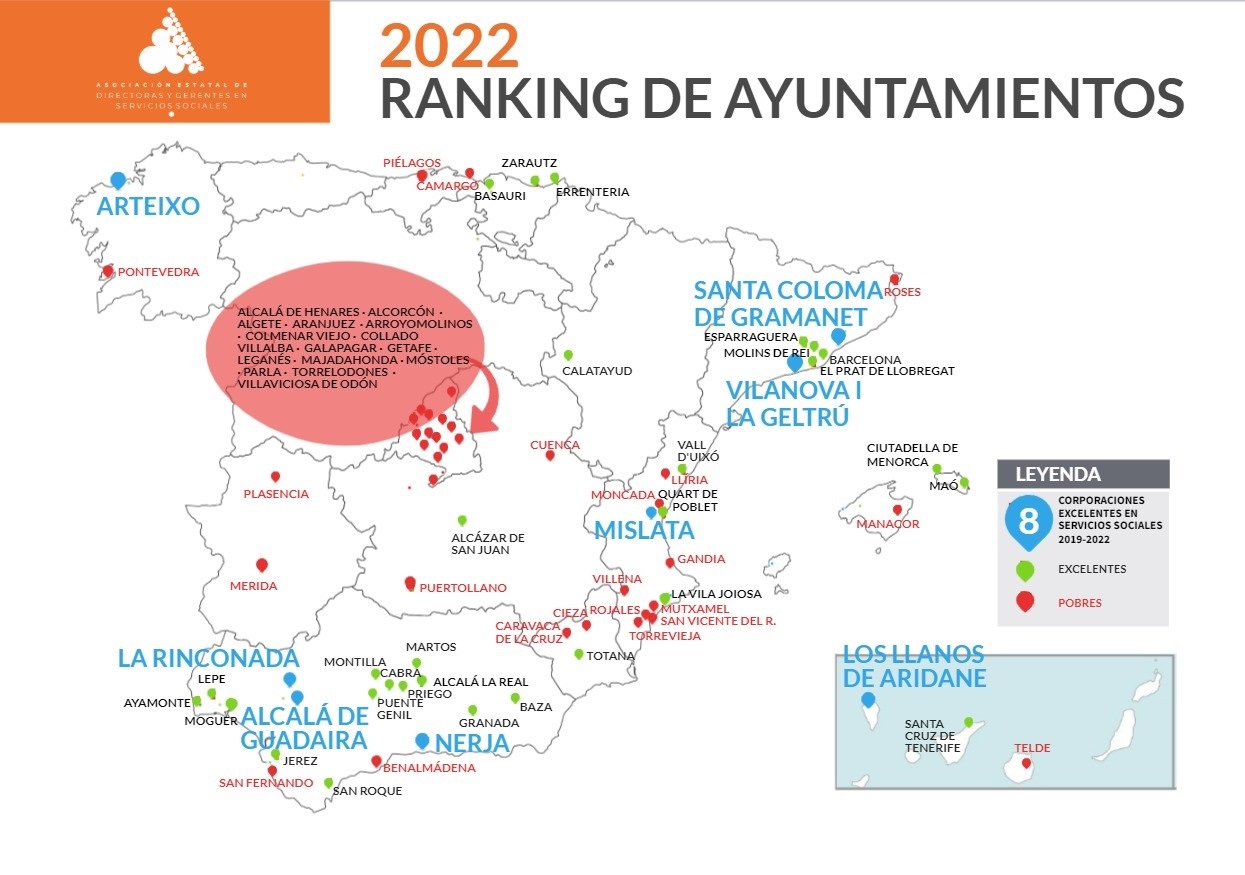 A partir de esa información, el estudio clasifica estos ayuntamientos en varias categorías: Excelentes (un total de 37 ayuntamientos), Corporaciones Excelentes (8 ayuntamientos que reuniendo los criterios de excelencia en 2022 han conseguido elevar el gasto social más de un 60% durante el periodo de 2019-2022) y Pobres (37 ayuntamientos con menos de 56,74 euros por habitante, frente a la media que se sitúa en el 94,57 euros por habitante).