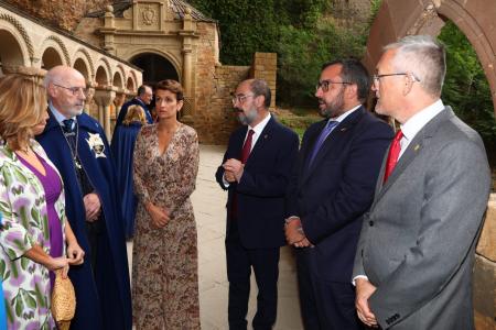 La presidenta ha sido recibida a su llegada al Monasterio, que acoge restos de monarcas del Reino de Pamplona, por el presidente de Aragón, Javier Lambán, y el presidente de las Cortes, Javier Sada, entre otras autoridades, y ha estado acompañada por el vicepresidente y consejero de Presidencia, Igualdad, Función Pública e Interior, Javier Remírez.