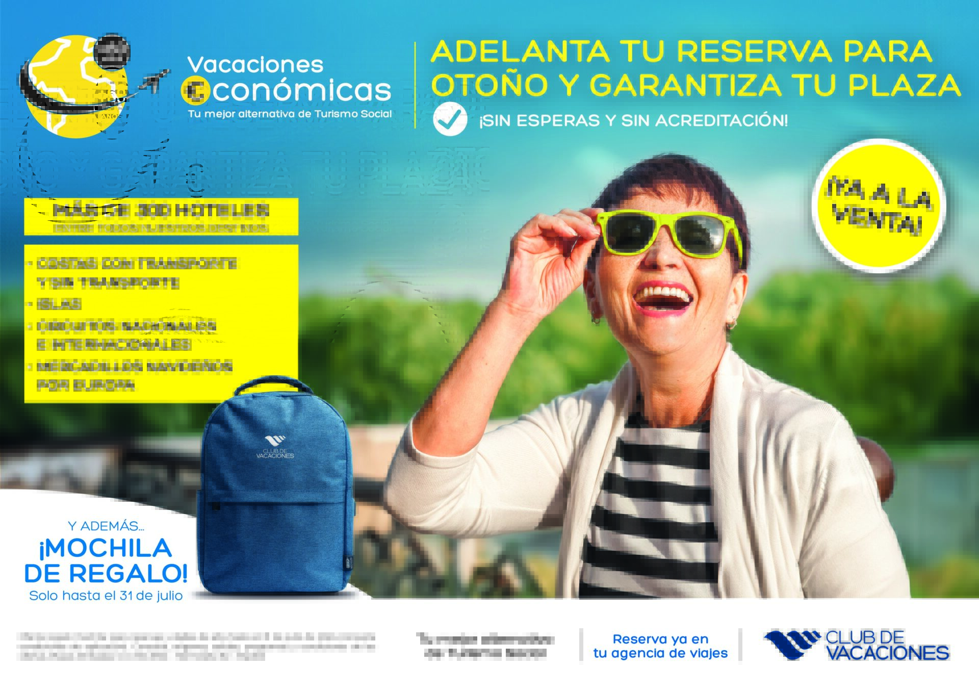Además, y solo hasta el 31 de julio, los clientes que formalicen su reserva del programa Vacaciones Económicas recibirán una mochila de Club de Vacaciones de regalo.