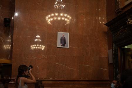 El Ayuntamiento de Barcelona ha colocado este viernes en un lateral de la sala de plenos un retrato de Felipe VI, después de que la sentencia del Tribunal Supremo obligara al consistorio a colocar un retrato del Rey, en una sesión que la alcaldesa Ada Colau preside llevando una mascarilla con la bandera republicana.