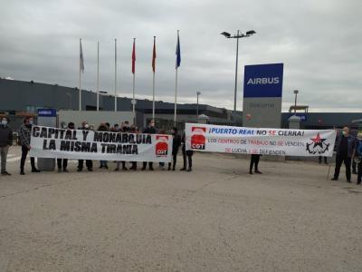 Concentración a las puertas de Airbus en Getafe (Madrid) contra el cierre de Puerto Real ante visita del Rey y Sánchez