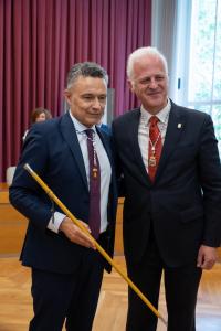 Tras recoger el bastón de mando de manos del alcalde saliente, Pablo Hermoso de Mendoza, Conrado Escobar ha querido agradecer el paso adelante de los 26 concejales «con los que compartiremos diferencias, acuerdos y dudas, en una legislatura diferente a la que acaba de concluir pero con dos importantes coincidencias».