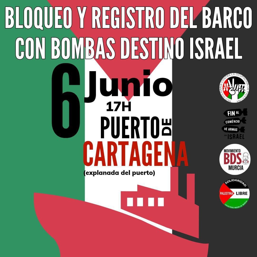 Las asociaciones Acampadas Universitarias, BDS Murcia y Palestina Libre Región de Murcia han convocado este jueves a las 17.00 horas una concentración en la explanada del Puerto de Cartagena ante la llegada del buque Vertom Odette prevista para las 16.00 horas, según han informado las agrupaciones en un comunicado.