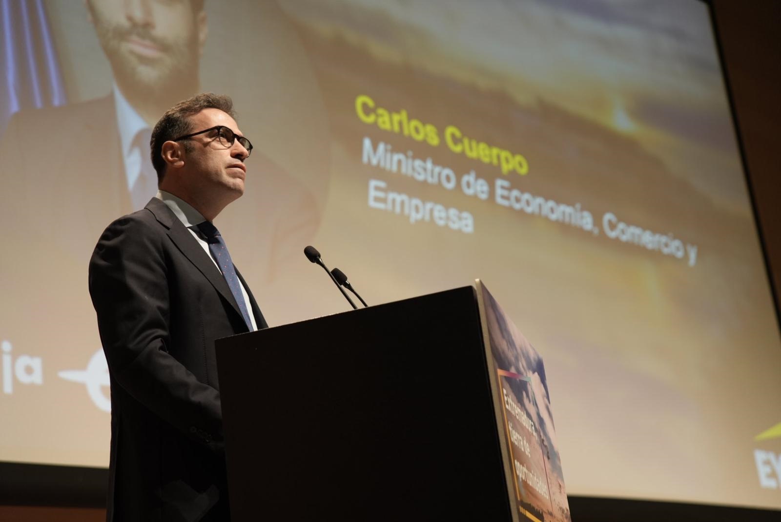 De esta manera se ha pronunciado Carlos Cuerpo este lunes durante su intervención en la jornada Extremadura, tierra de oportunidades , organizada por EY e Ibercaja, en el Edificio Siglo XXI en Badajoz y que ha definido como un espacio donde compartir su visión sobre los retos y oportunidades de la región, y de escuchar tanto en las siguientes sesiones de la jornada, como a los empresarios cuál es la situación real y cómo se puede contribuir desde el Gobierno «para hacer que Extremadura sea a futuro una historia de éxito, aún más de lo que lo está siendo hoy día».