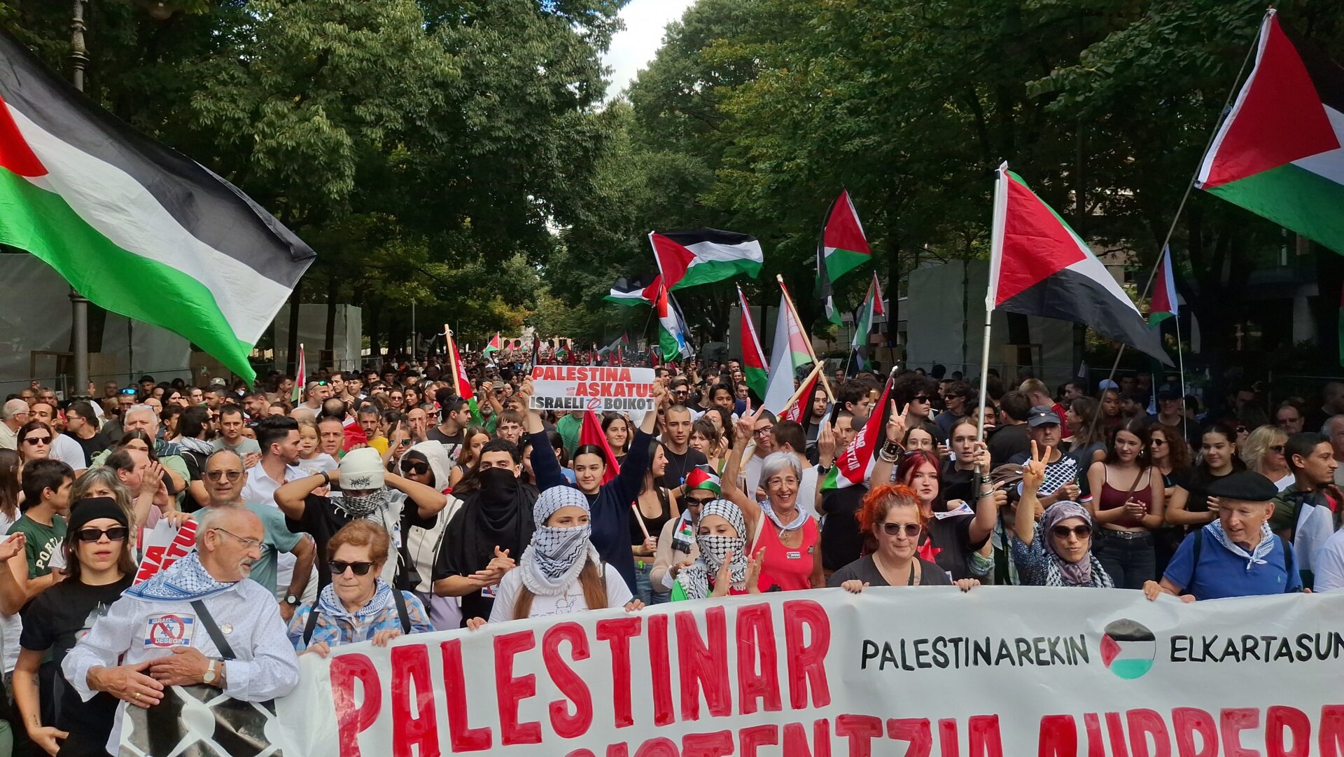 A lo largo del recorrido se han coreado consignas como Boicot Israel, Palestina askatu , No es una guerra es un genocidio , Gora Palestina erresistentzia (Viva la resistencia del pueblo palestino) o Dos estados no, Israel disolución . Un gran número de personas ha flanqueado la marcha a lo largo del recorrido para sumarse después a la manifestación.