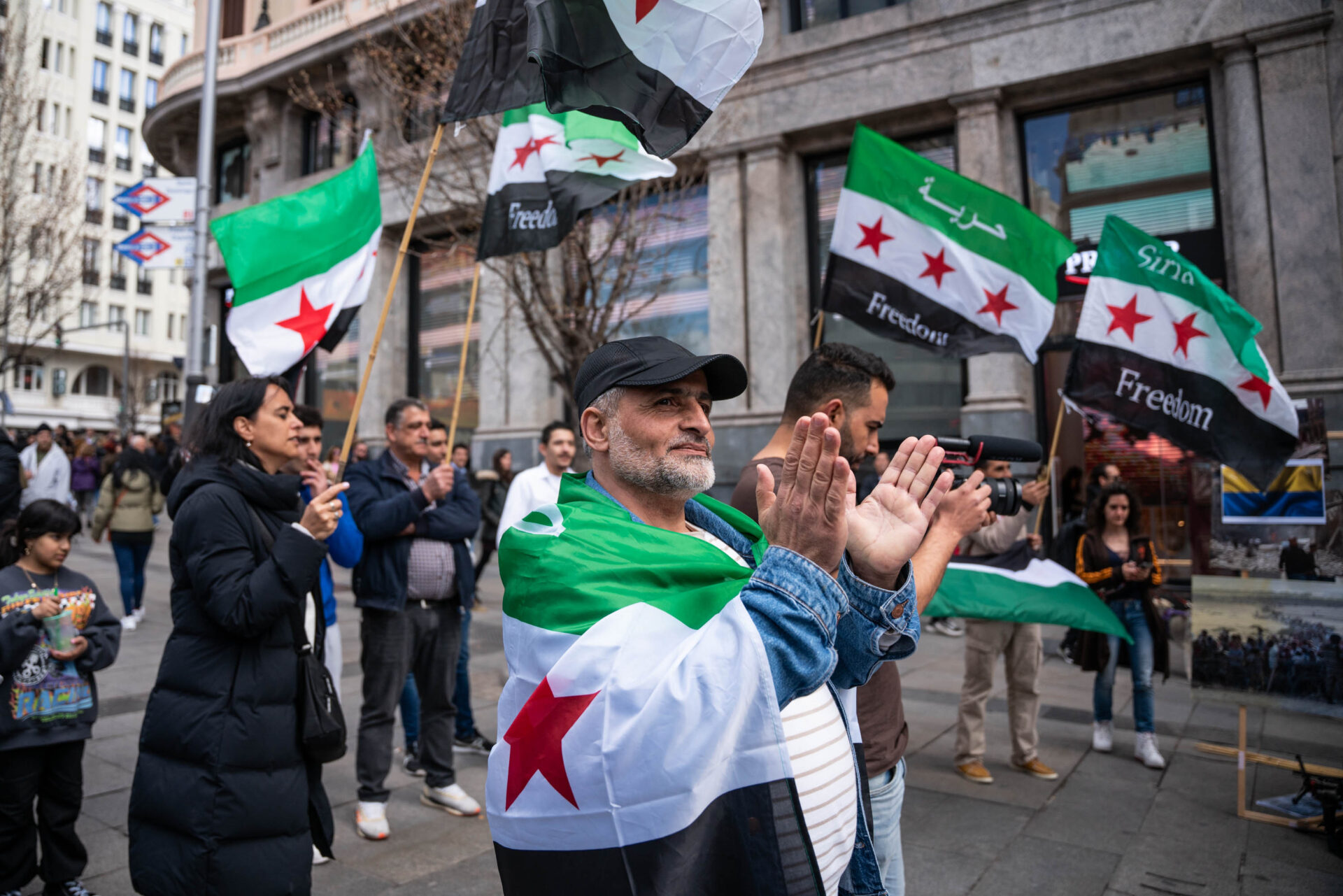 Decenas de personas se concentran frente a la Embajada de Siria en Madrid que cambia la bandera por la de los rebeldes