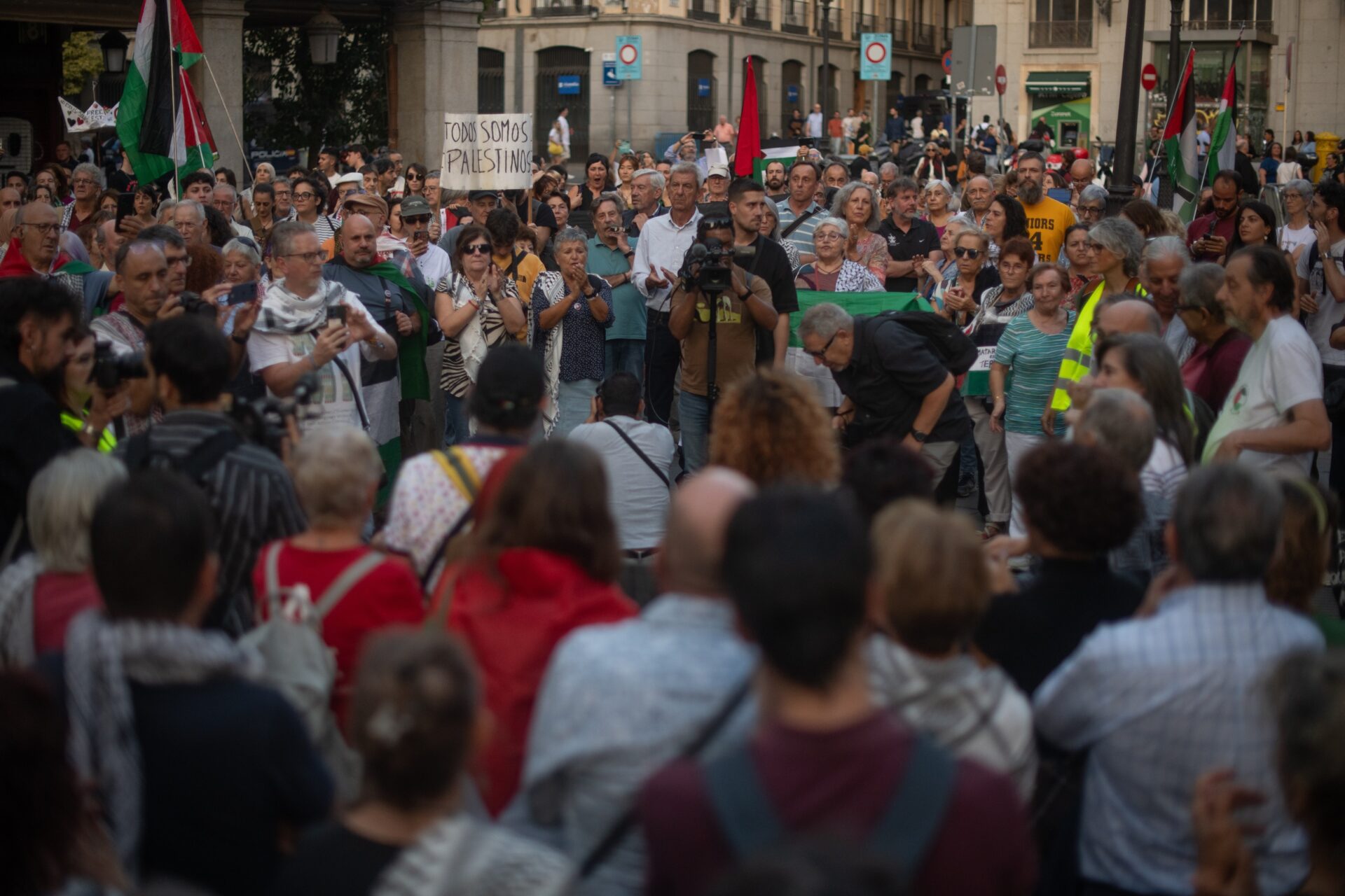 Entre los asistentes a la manifestación se han escuchado gritos que coreaban «Que viva la lucha del pueblo palestino», «La flotilla no se toca», «Israel asesino», «Cada niño muerto es un niño nuestro», «No es una guerra, es un genocidio», «Vosotros sionistas, sois los terroristas», «Boicot Israel» o «Aquí están los antisionistas». Unos cantos precedidos por un minuto de silencio y acompañados por banderas palestinas y pancartas en las que se podía leer Palestina vencerá y No hay fuerza que pueda acabar con un pueblo .