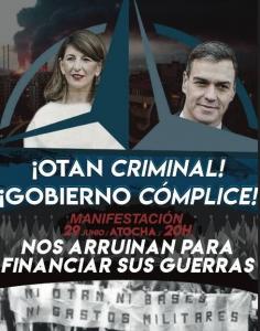 La protesta, convocada por un miembro de ultraizquierda, tenía previsto comenzar a las 20 horas en la calle Atocha, junto a la plaza de Neptuno, y finalizar en la plaza de Jacinto Benavente. La comunicación oficial lleva el lema No a las guerras. No a la OTAN, por la paz . En cambio, en la comunicación en Internet y redes sociales el cartel reza ¡OTAN criminal, Gobierno cómplice! Nos arruinan para financiar sus guerras , con las caras del presidente Pedro Sánchez y de la vicepresidenta Yolanda Díaz.