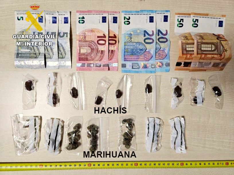 En el registro de su bolso, los agentes encontraron 9 envoltorios con diferentes cantidades de hachís y otros 7 con marihuana, que, por su forma de dosificación, se presume que estaban preparados para su venta al menudeo. También llevaba billetes de 50, 20, 10 y 5 euros, que se sospecha sean fruto de ventas ya realizadas.