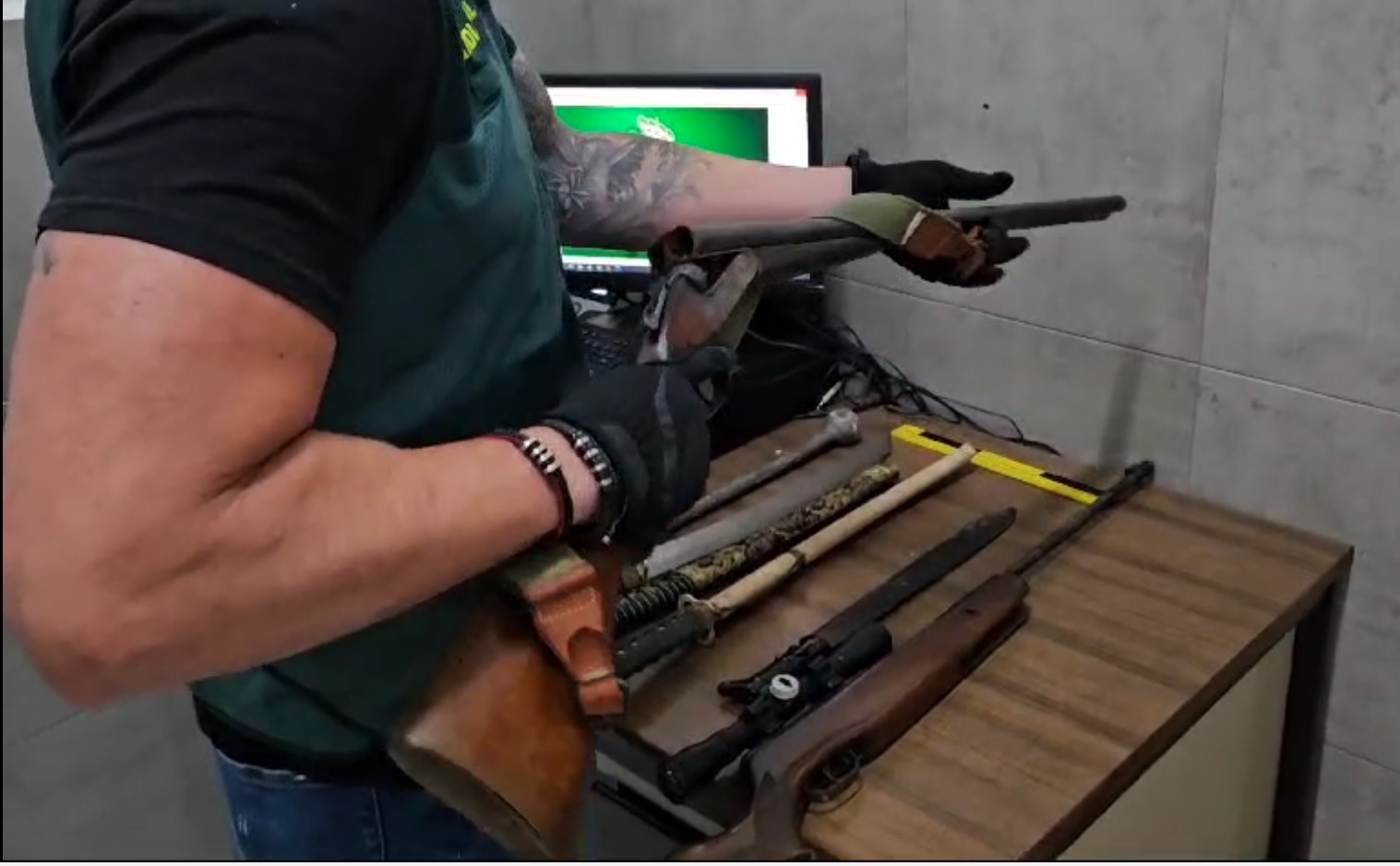 A continuación, los guardias civiles aseguraron la vivienda, incautaron las armas y procedieron a la detención de las cinco personas, además de realizar un registro de la vivienda, donde fue hallado e intervenido un polo oficial técnico de la Guardia Civil y bridas.