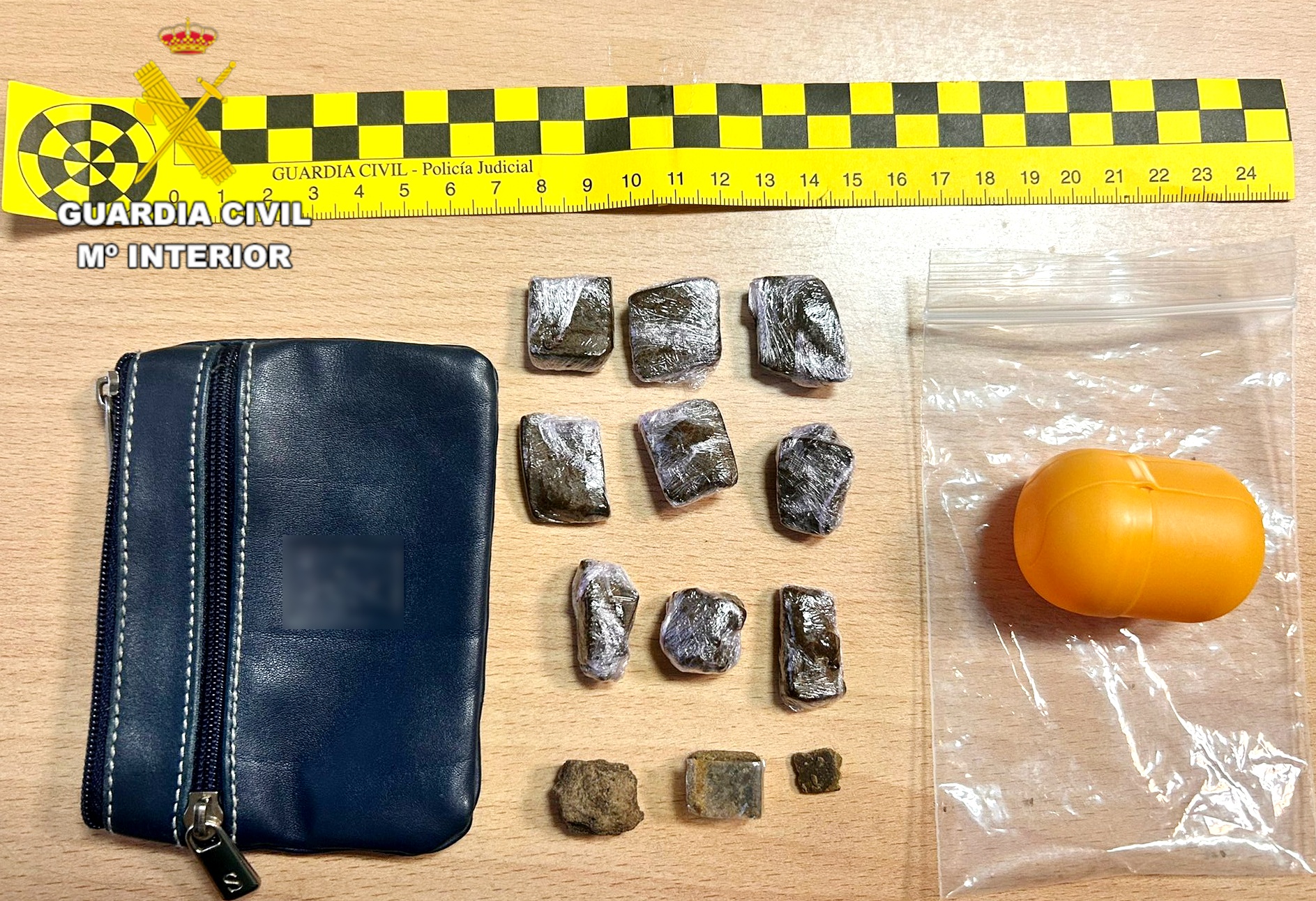 Fue identificado y registrado y se encontraron en el interior de su cartera 12 trozos de hachís envueltos en plástico transparente, preparados para su presunta distribución al menudeo, que le fueron intervenidos.