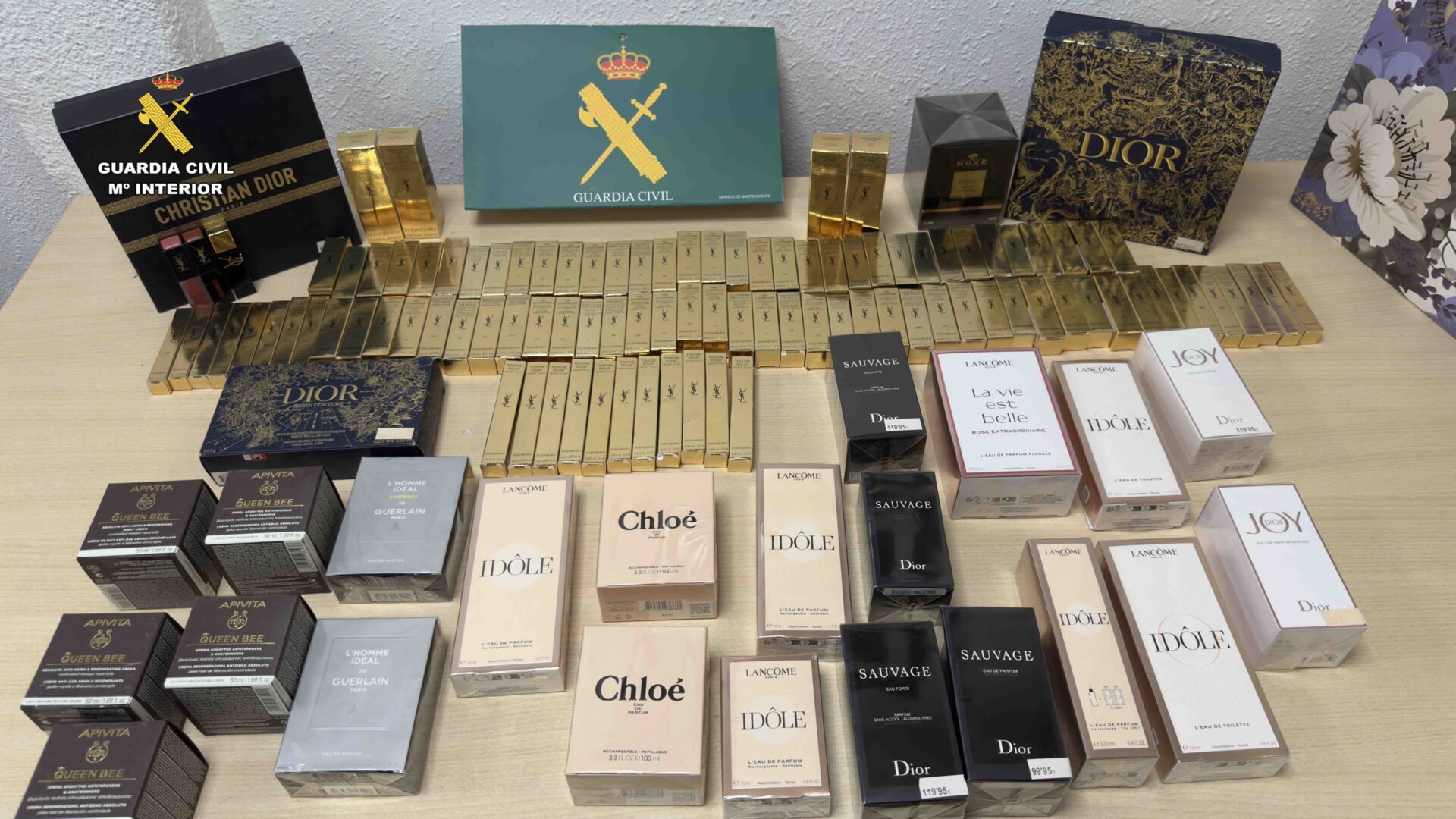 En el maletero del coche se encontraron dos bolsas de papel cartón revestidas en su interior con papel de aluminio, utilizadas para inhibir los sistemas de alarma de los comercios. Además, se hallaron 127 artículos de cosmética y perfumería de marcas de prestigio, de alto valor.
