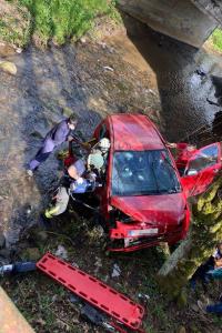 Dos mujeres, de 85 y 49 años, y un menor, de 13, han resultado heridos leves este mediodía tras caer el coche en el que viajaban al arroyo Álamos, afluente del Pisueña, en Vega de Villafufre.