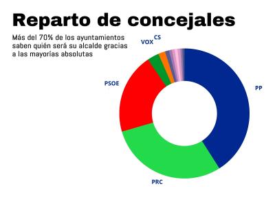Tras el PP, el PRC es el segundo partido que ha logrado más mayorías absolutas, si bien ha perdido más de 50 concejales en los municipios cántabros y se ha quedado a punto de conseguir los 300.