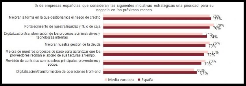 La mejora de la gestión de deuda (73%) y la optimización de los procesos de pago para garantizar que los proveedores reciban el abono de sus facturas en fecha (72%) también han figurado entre las líneas estratégicas de la mayoría de compañías españolas.
