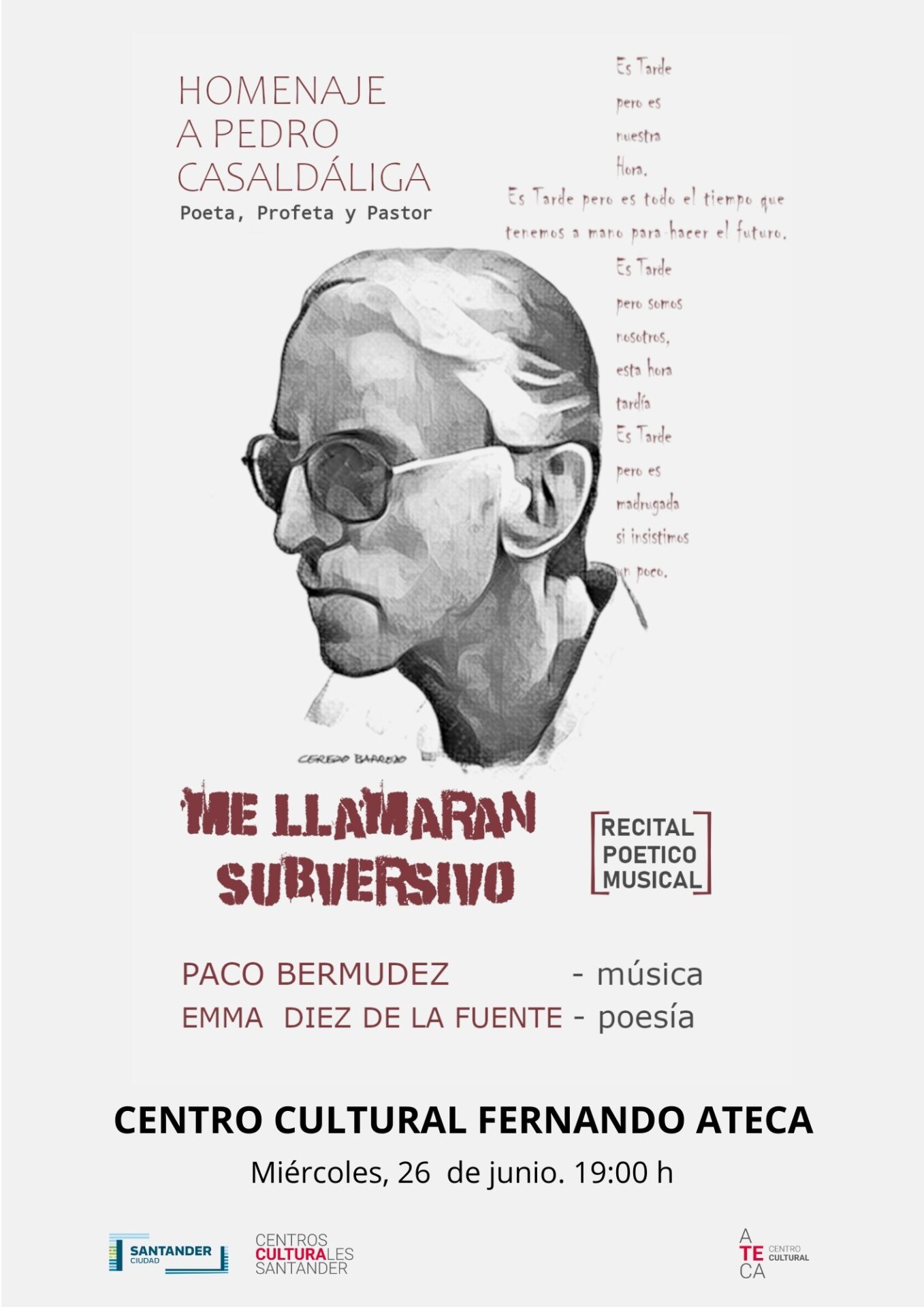El centro cultural Fernando Ateca de Monte acoge este miércoles el recital poético Me llamarán Subversivo , que está basado en la vida y obra del poeta, profeta y pastor, Pedro Casaldáliga, y que se compone de una selección de sus poemas con las que se pretende acercar a los asistentes a la realidad religiosa, social y política que vivió al autor, así como el devenir de lo que él llamará «mis causas».