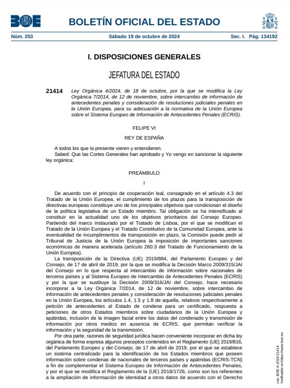 La Ley Orgánica sobre intercambio de información de antecedentes penales y consideración de resoluciones judiciales penales en la Unión Europea fue inicialmente aprobada por unanimidad en el Congreso y sólo en su última fase parlamentaria en el Senado, tras una denuncia de la AVT quejándose de que la convalidación de penas también afectaba a presos de ETA, perdió el apoyo de PP y Vox y fue rechazada por el Pleno de la Cámara Alta el día 14 de octubre.