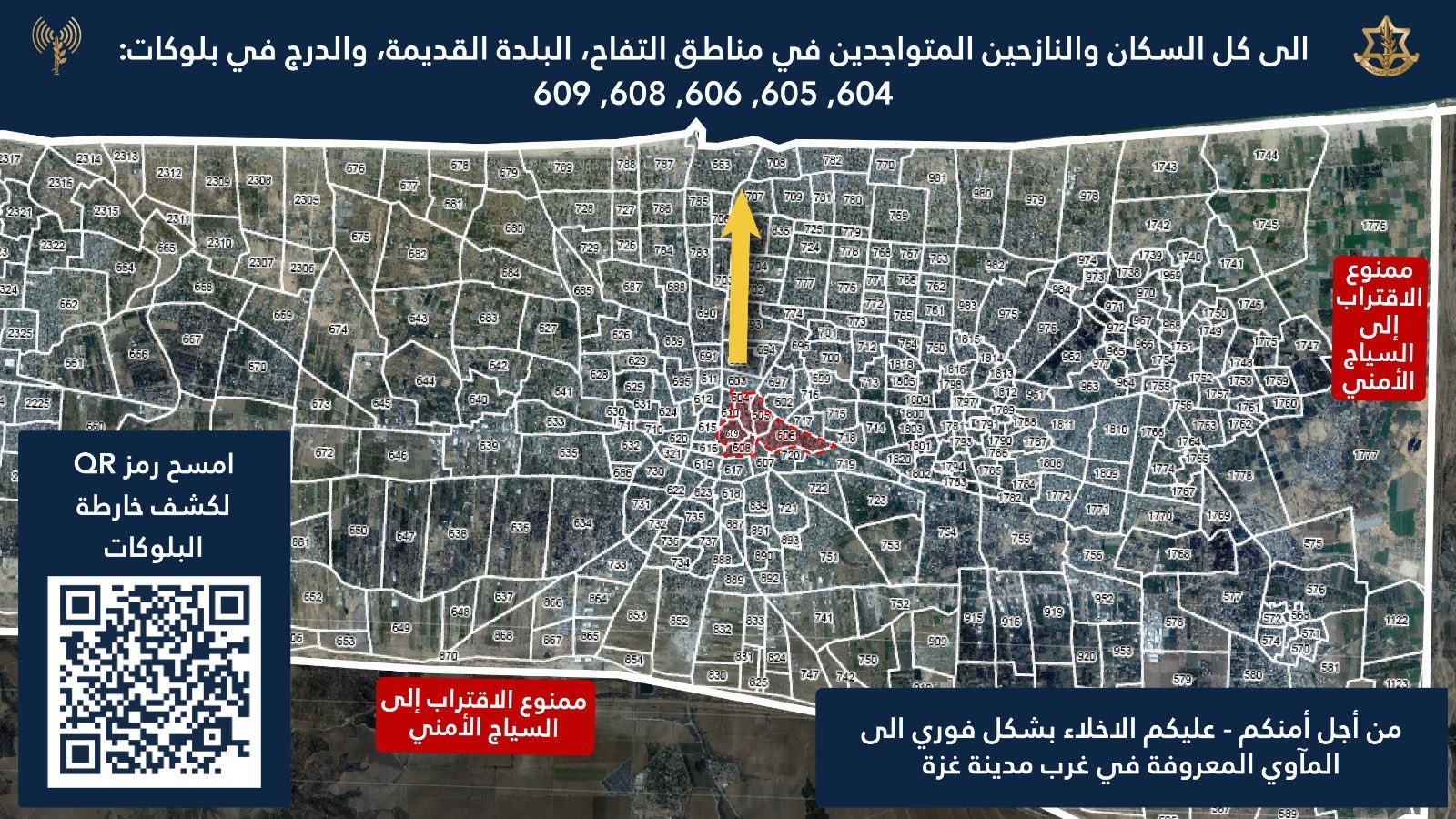 La orden afecta a los barrios de Tufá, Daraj y la ciudad vieja — los sectores 604 a 606, 608 y 609 — según ha hecho saber el portavoz en árabe del Ejército de Israel, Avichay Adraee, en su cuenta de la red social X, donde insta a los residentes que se desplacen a refugios en el oeste de la localidad.