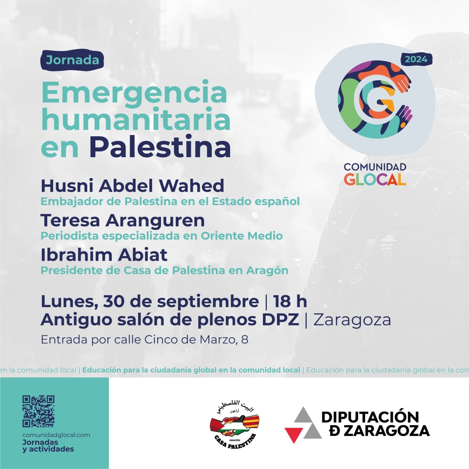 La nueva edición del programa Comunidad Glocal arranca con su primer eje temático que aborda la situación de los derechos humanos en Palestina. La primera de las tres jornadas de Glocal tendrá lugar este lunes 30 de septiembre a las 18.00 horas en el antiguo salón de plenos de la Diputación de Zaragoza. La entrada será libre hasta completar aforo.