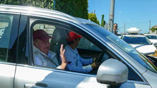 Durante el recorrido en coche de los algo más de 300 metros que separan el muelle del club náutico, el emérito ha vuelto a saludar a periodistas y curiosos congregados, asintiendo con la cabeza y sonriendo con la ventanilla ligeramente bajada.