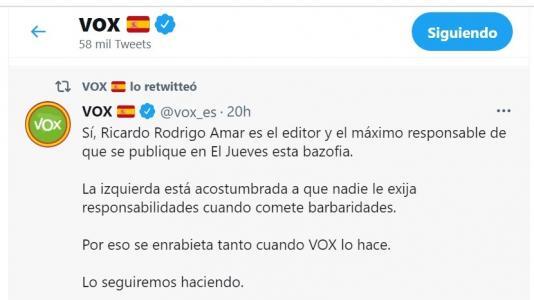 «Se llama Ricardo Rodrigo Amar y es presidente de RBA, grupo que edita El Jueves . Su revista difunde odio contra millones de españoles a diario. Es posible que muchos de ellos le empiecen a exigir responsabilidades cuando le vean salir de su despacho de la Diagonal de Barcelona», reza el tuit publicado este martes en la cuenta oficial de Vox.