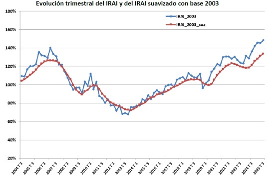 El Índice Registral de Actividad Inmobiliaria (IRAI) registró un incremento del 2,2% en el tercer trimestre del año, mientras que la variación anual ascendió al 9%, impulsada por los incrementos en los precios de compraventas y las hipotecas, según el Colegio de Registradores.