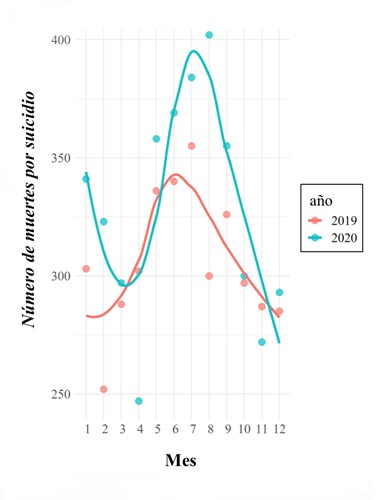 En 2019, 3.671 personas se quitaron la vida en España y en 2020 la cifra ascendió a 3.941; aunque el número es mayor, no refleja una diferencia estadísticamente significativa, según los investigadores. Lo que sí llama la atención de estos investigadores es la tendencia de 2020, con bajadas y subidas pronunciadas en meses relevantes de la emergencia sanitaria.